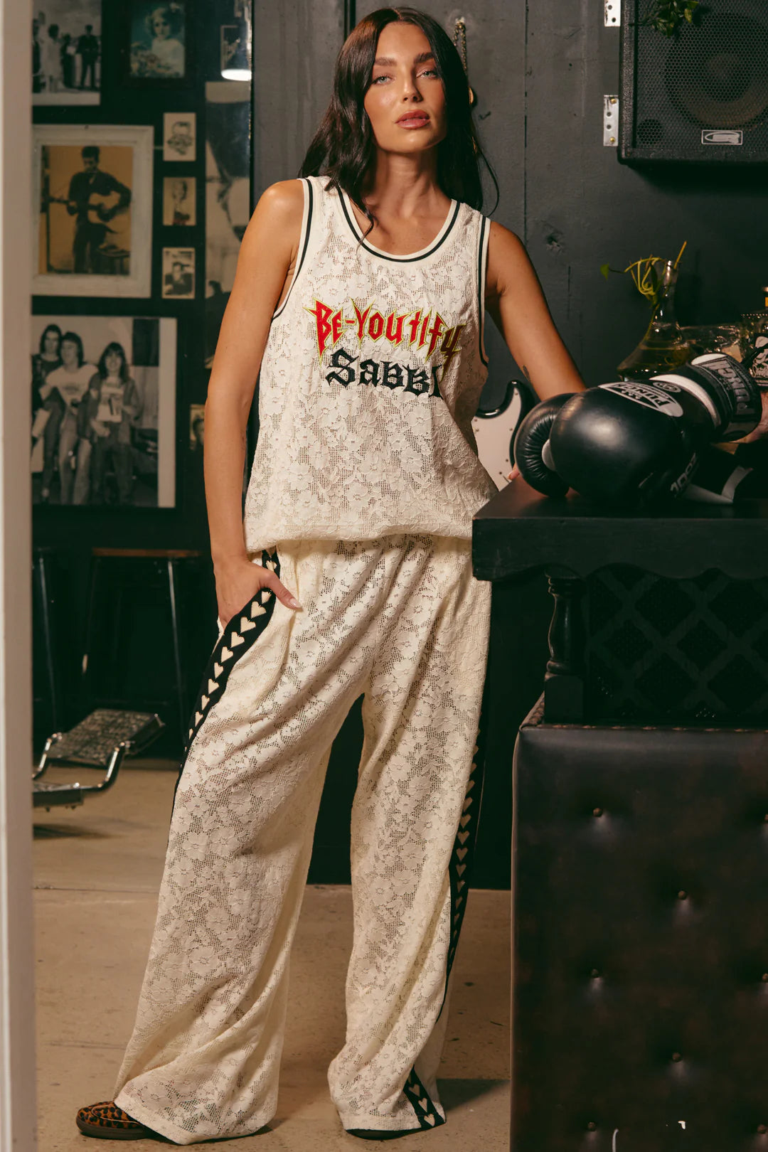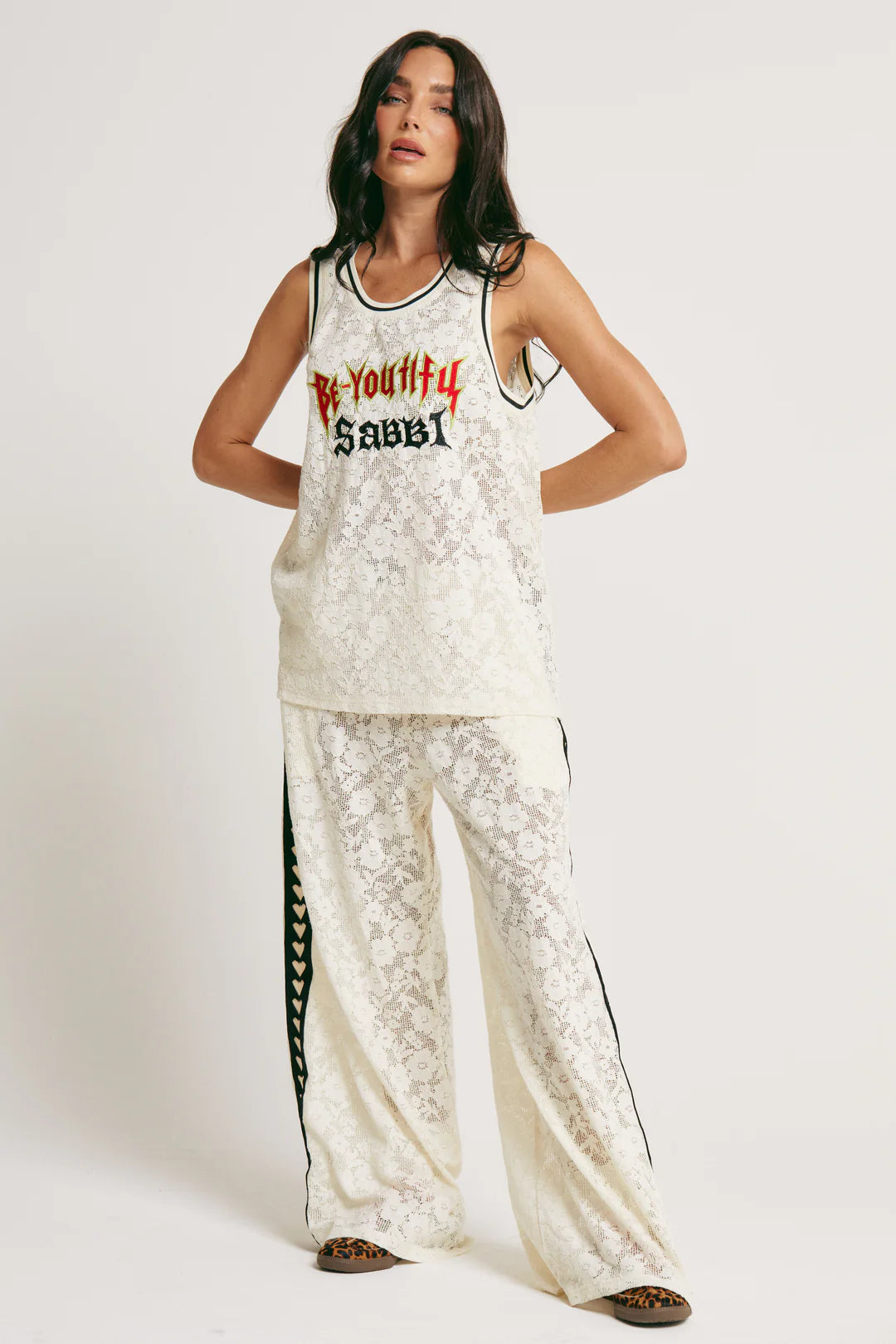 These wide-leg lace pants are sheer trouble (literally). Featuring contrast heart-trimmed side panels and an elastic waistband stamped with Sabbi pride, they're equal parts romantic and rebellious.
