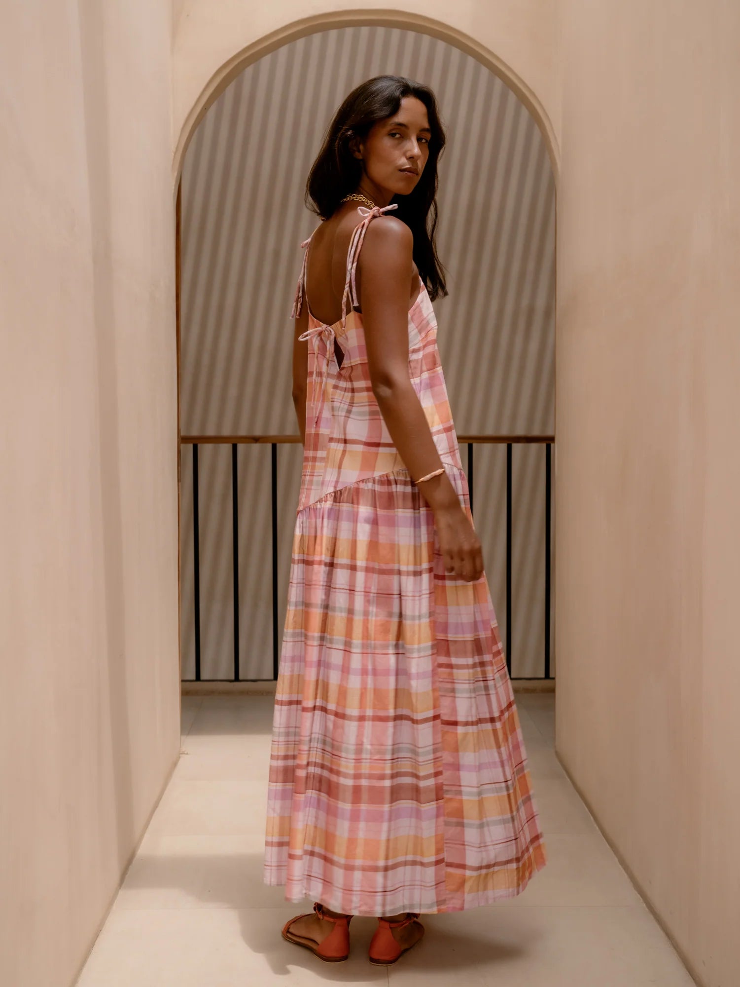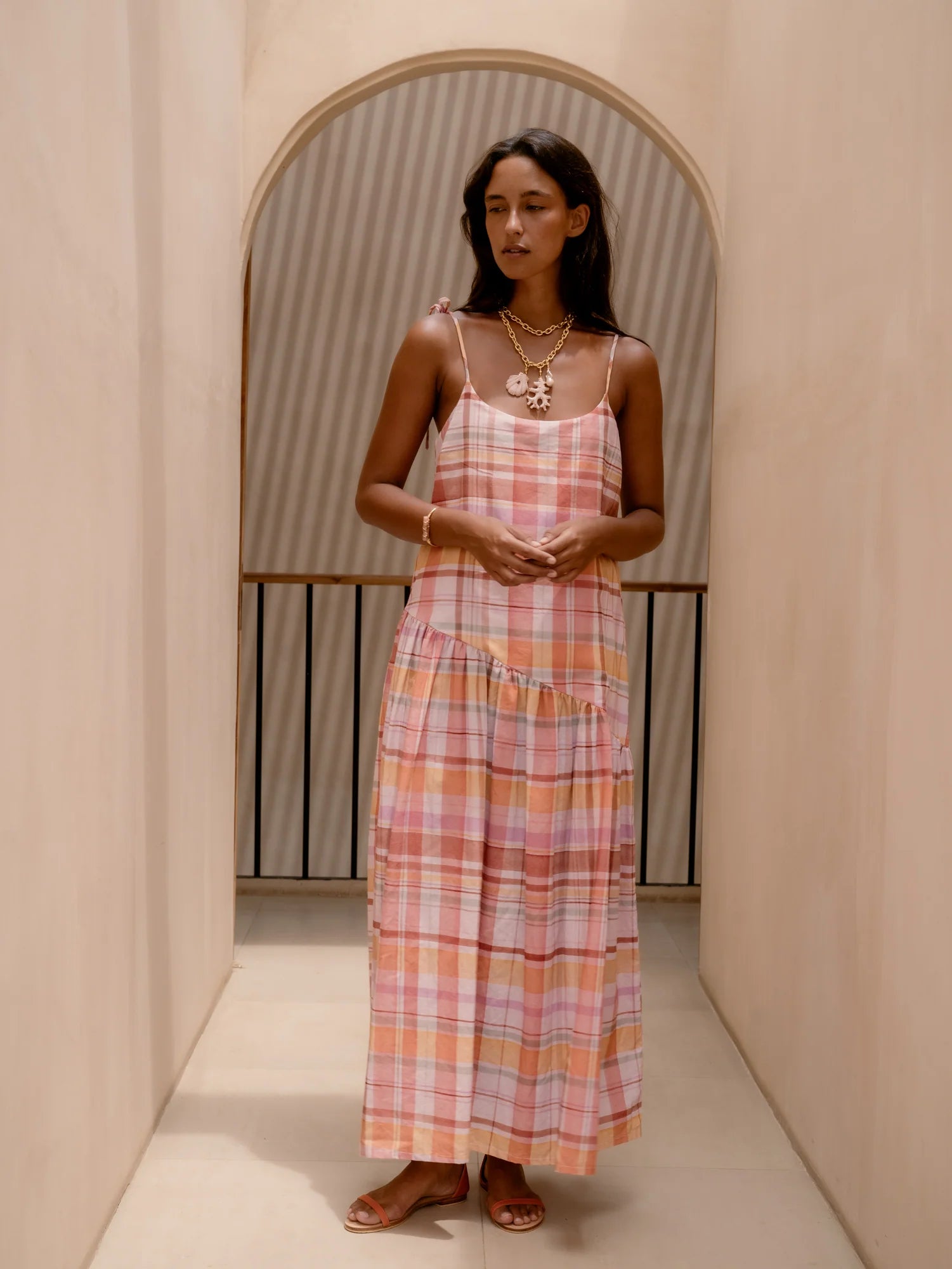 The Adeline Dress is a timeless piece made for slow summer days and barefoot evenings. The bodice is crafted from cotton poplin in pastel pink plaid. A flowing skirt, falls beautifully into an asymmetrical drop-waist hemline that moves with every step.