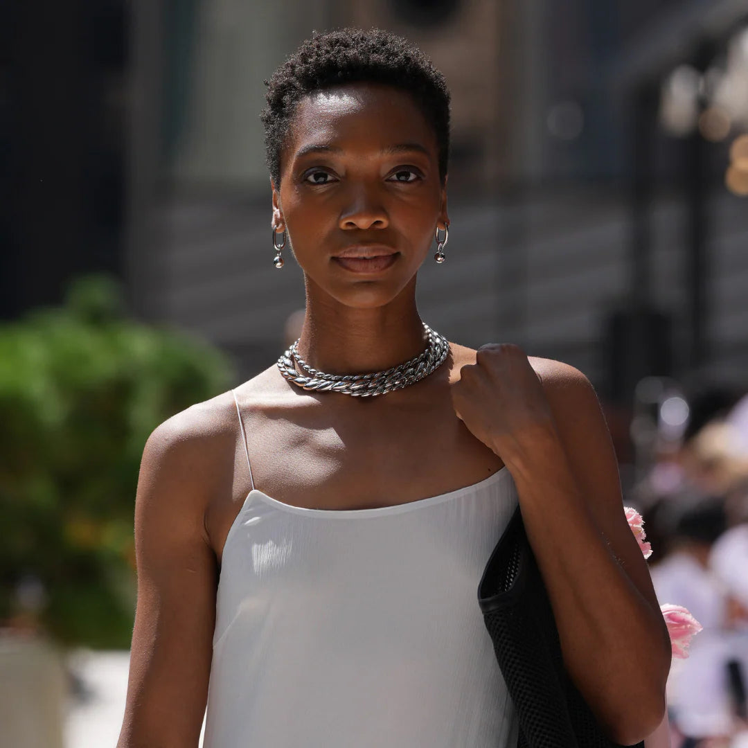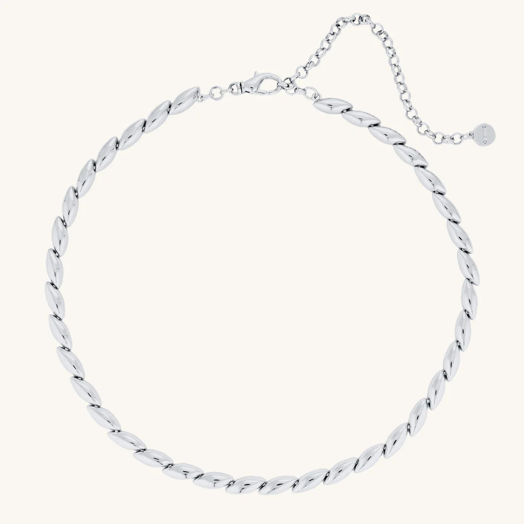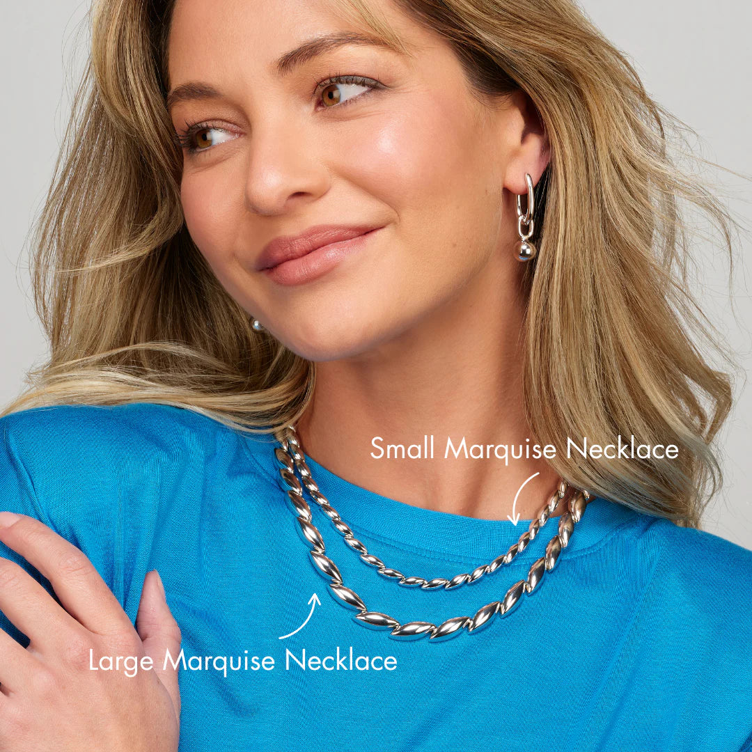 The Small Marquise Necklace in Silver brings a sleek, modern edge to a timeless silhouette. Its polished marquise-shaped links sit elegantly against the neckline, offering a versatile piece that can be styled for both day and night.