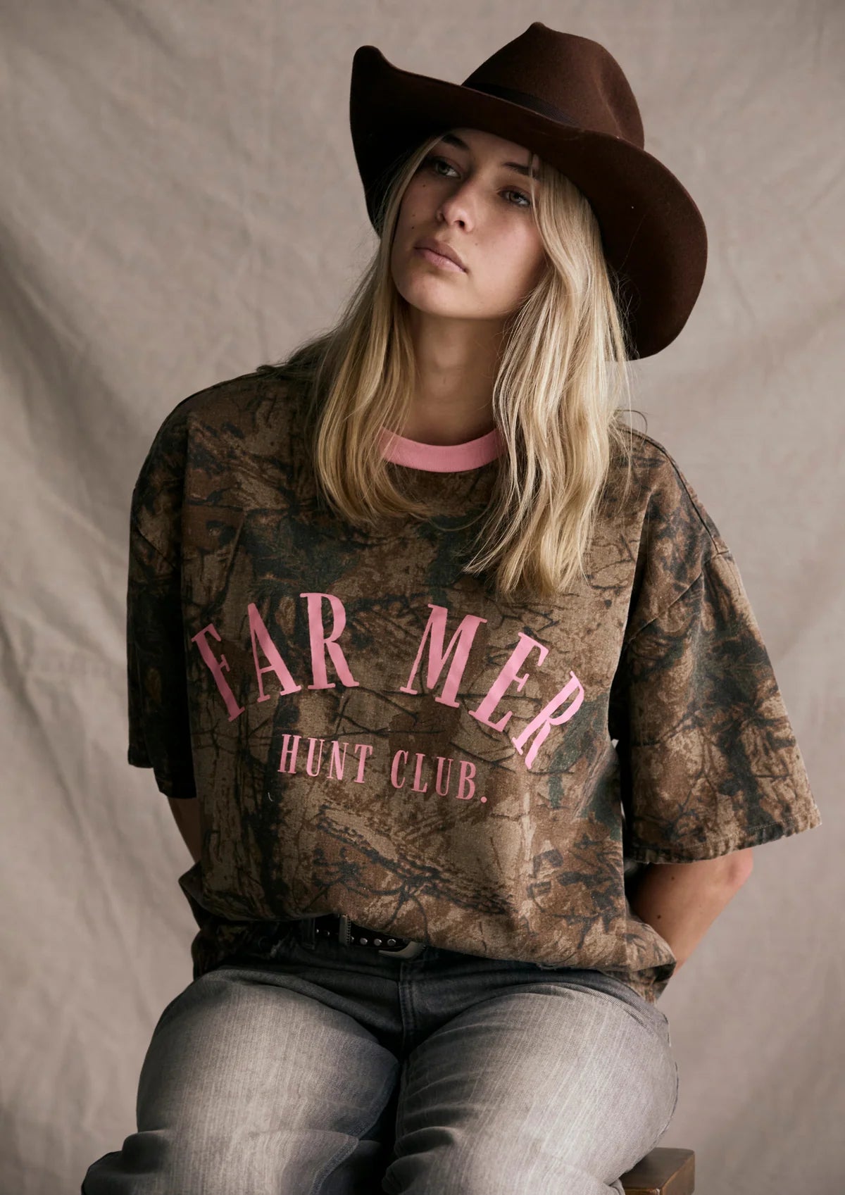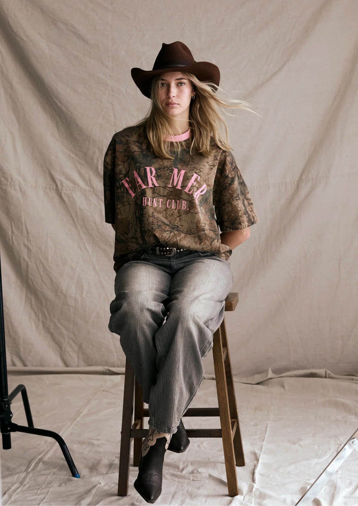 The Farmer by Whitney Hunt Club Tee is cut from heavyweight cotton with a rigid finish and features an all-over camouflage print. Designed with a slightly shorter body, its boxy silhouette and exaggerated sleeves deliver bold structure. A contrast pink ribbed crew neckline and signature pink Far Mer Hunt Club branding seal the look with attitude. Drops Sunday 29 June at 7PM AEST via select stockists and online.
