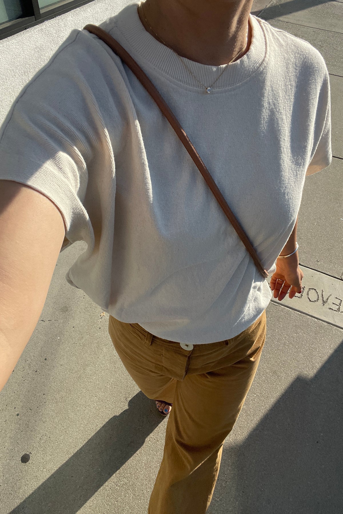 Jeanne Tee is our perfect muscle tee. She features a shorter length to pair perfectly with high waisted bottoms but still give enough coverage for mid-rise bottoms and just the right amount of off shoulder dolman sleeve. She has a high crew neck with an extra wide neckband that adds to her signature charm.