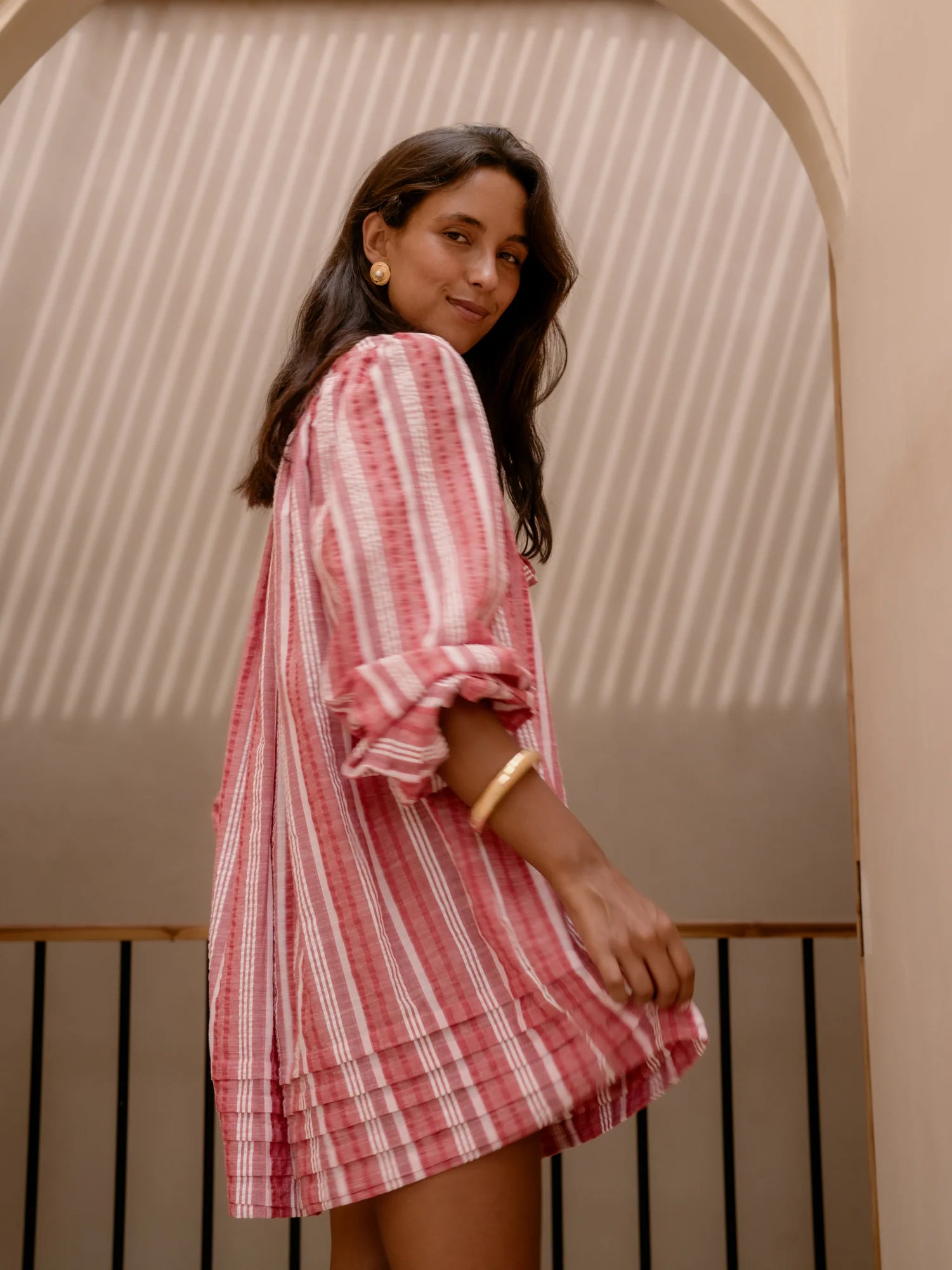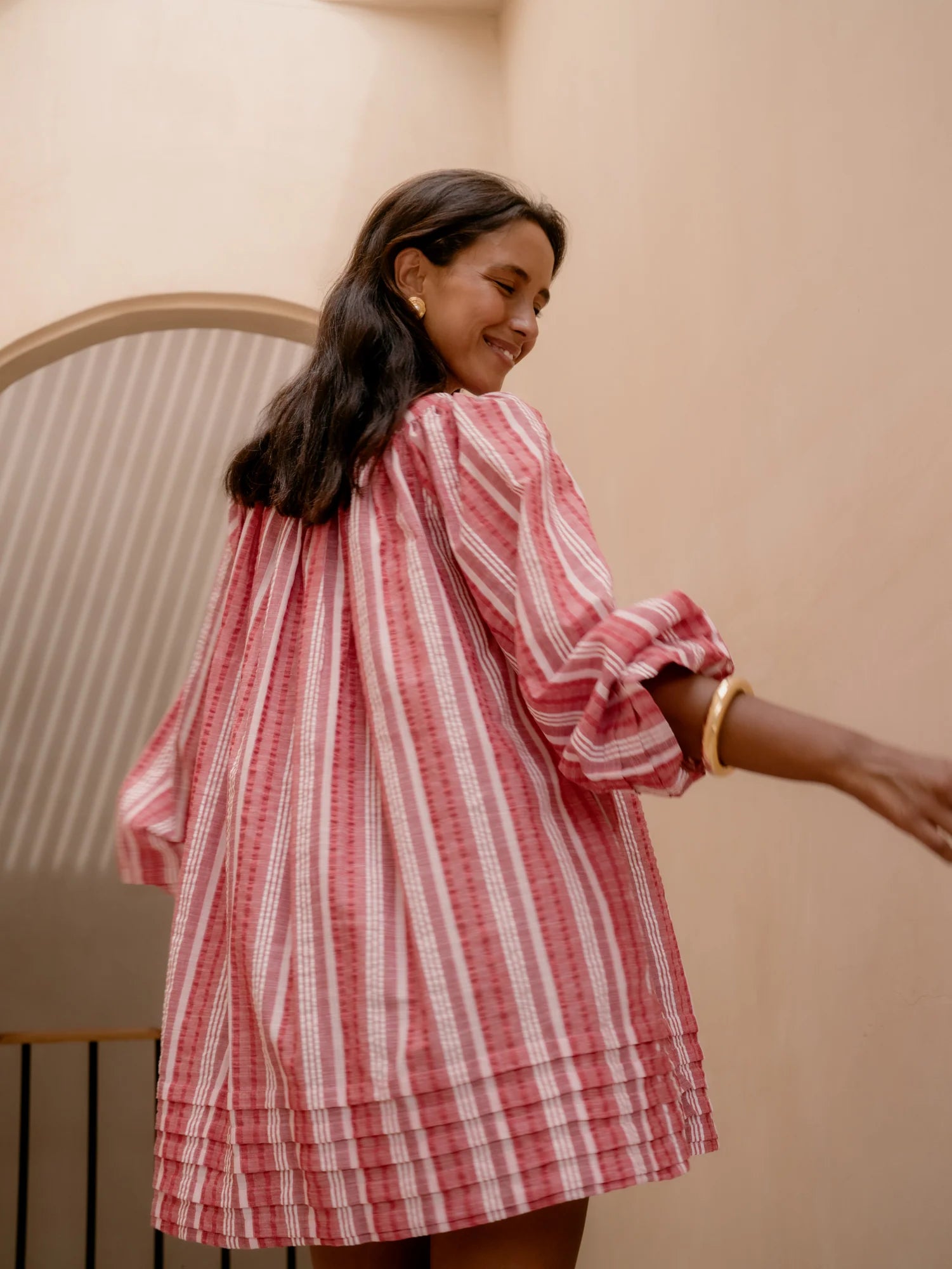 The Sammie dress is crafted from airy cotton, subtly gathered at the neckline to create a billowy silhouette and detailed with pin tuck cuff on a flouncy balloon sleeve and hemline.