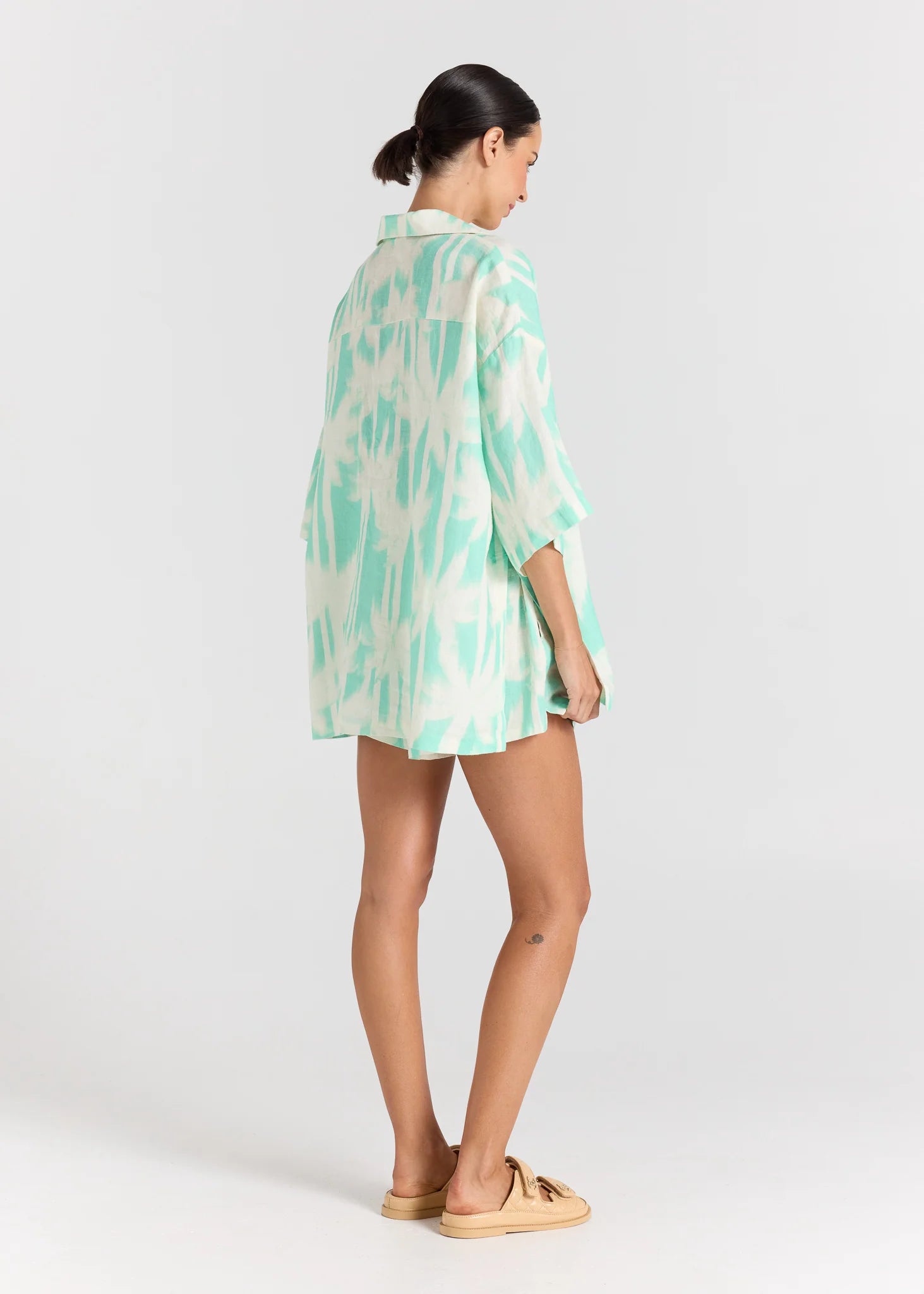 The Palms Overshirt is an effortless layering piece designed for relaxed resort dressing. Cut in an oversized silhouette from breathable 100% linen, it drapes softly for an easy, laid-back feel. Featuring a button-through front, side slits, and a fluid shape, it’s perfect worn open over swim or styled with matching separates for a coordinated look. The mint palms print brings a fresh, sun-washed softness, making this piece a go-to for warm days, beach escapes, and off-duty moments alike.